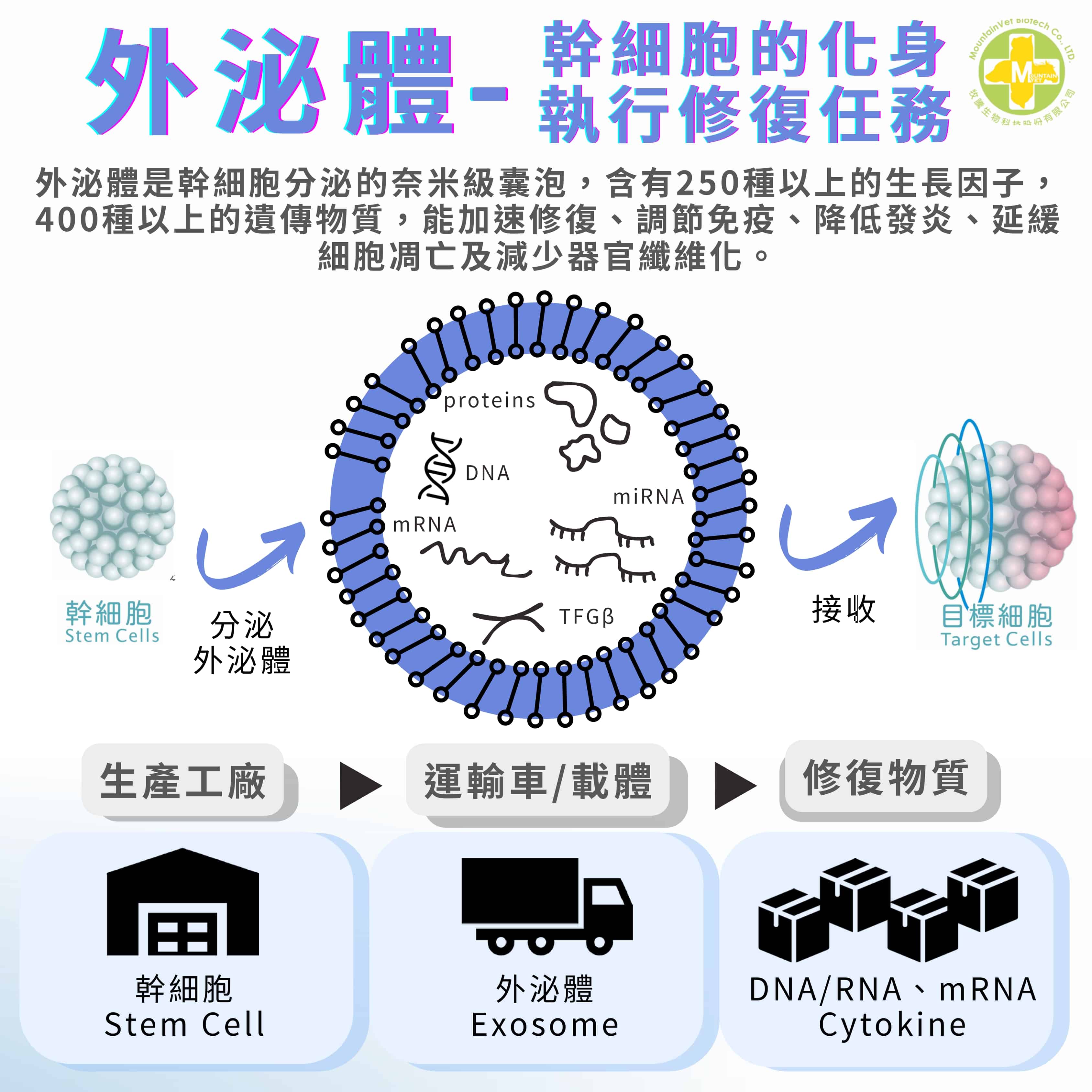 外泌體是幹細胞分泌的奈米級囊泡,大小約50-200奈米,能夠主動跑到損傷的組織附近發揮功能。簡單來說,幹細胞像是身體的工廠,外泌體則是負責運送貨物的卡車,不斷的將修復物質運送到需要的地方。