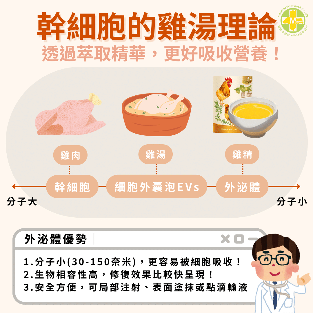 外泌體是幹細胞分泌的微小囊泡,攜帶著大量有助於組織修復及調節免疫的因子。相較於幹細胞,有著分子小,更容易為人體所吸收利用的優勢。就像是我們把雞肉萃取成為雞湯或是雞精,能快速吸收營養,讓身體可以更快更好的恢復功能!