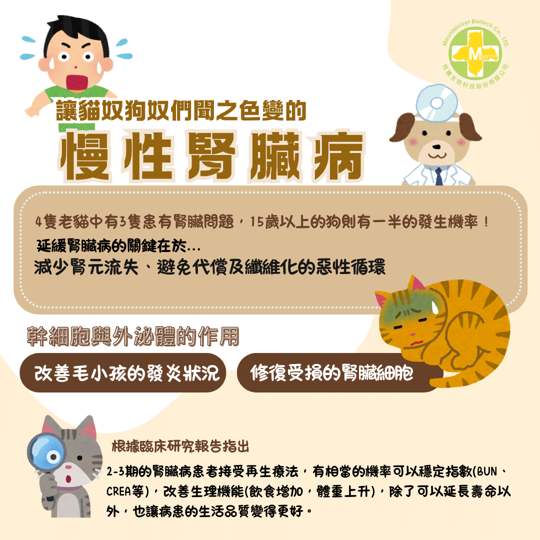 慢性腎臟病是所有飼主們最擔心毛小孩的問題之一,除了傳統治療以外,現在有了新的輔助療法可以幫助狗狗貓咪們改善病情。幹細胞與外泌體可以協助降低發炎反應、修復受損的腎元,狗奴貓奴們請為您的毛小孩了解一下吧!