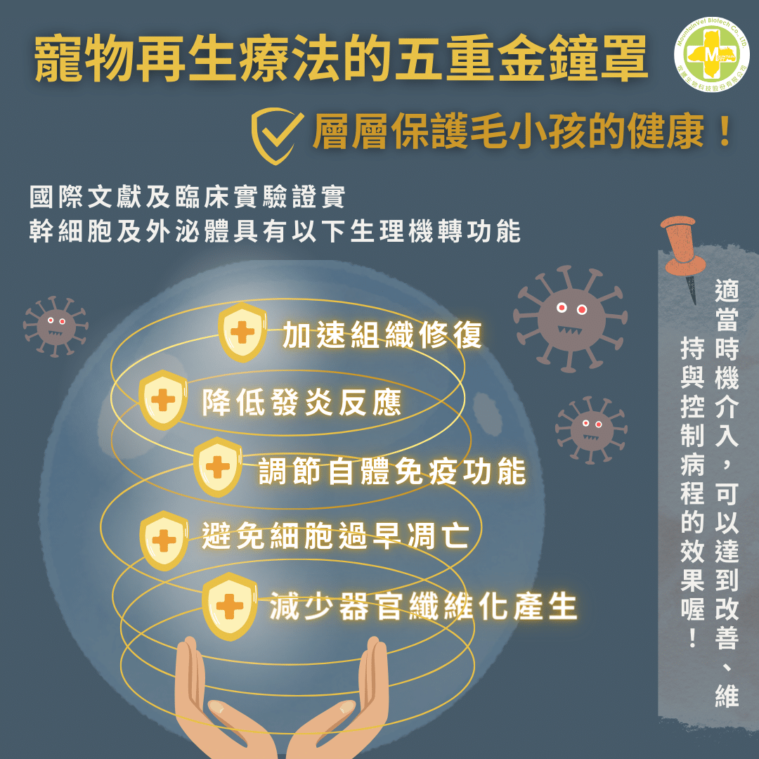 幹細胞及外泌體的五大功能就像是五層的金鐘罩,層層保護毛小孩的健康!適當時機使用再生療法,就能得到比較好的改善效果。