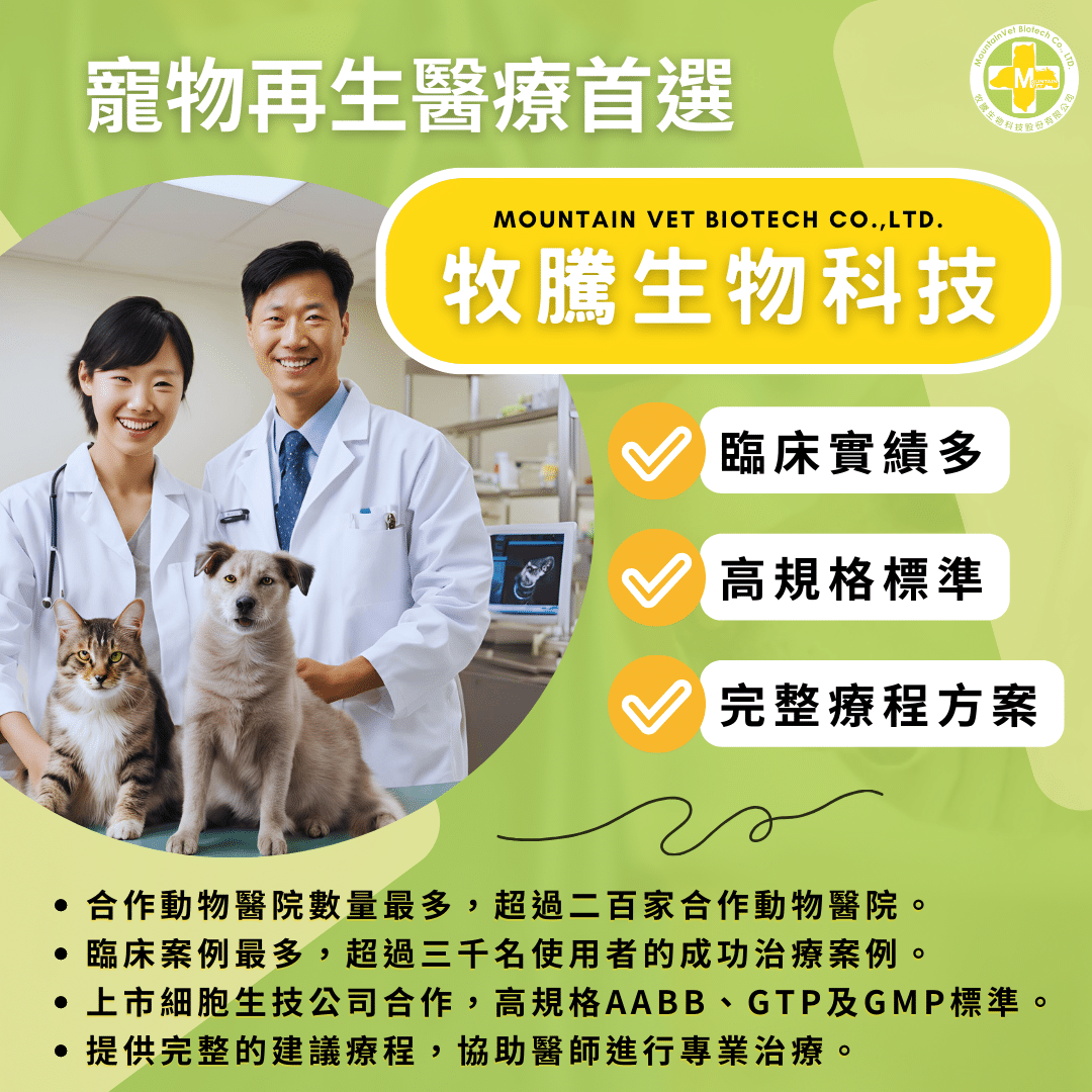 寵物再生醫學的首選品牌-牧騰生物科技,擁有最多合作醫院,最多臨床案例及完整療程規劃,值得信賴!